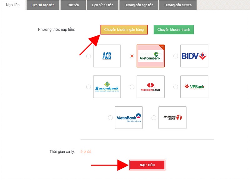 Tiếp theo, tại giao diện nạp tiền Lixi88 các bạn hãy chọn Chuyển khoản ngân hàng để có thể tiến hành nạp tiền vào tài khoản nhà cái Lixi88 qua ngân hàng. Bạn hãy chọn ngân hàng muốn gửi và hãy bấm vào NẠP TIỀN. Như hình dưới đây mình chọn ngân hàng Vietcombank.