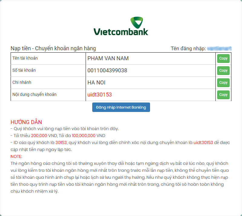 Sau khi các bạn bấm vào NẠP TIỀN, một cửa sổ mới cũng sẽ hiện lên cùng với các thông tin tài khoản ngân hàng của Lixi88. Các bạn hãy tiến hành chuyển khoản vào tài khoản này thông qua internet banking.