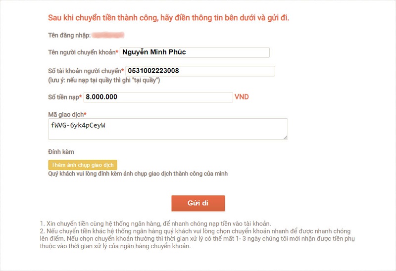 Sau khi bạn chuyển tiền xong thông qua internetbanking, các bạn hãy điền các thông tin đầy đủ như hình ảnh dưới đây để nhà cái Lixi88 nhận được lệnh nạp tiền của bạn. Sau khi điền xong, các bạn bấm vào Gửi đi.