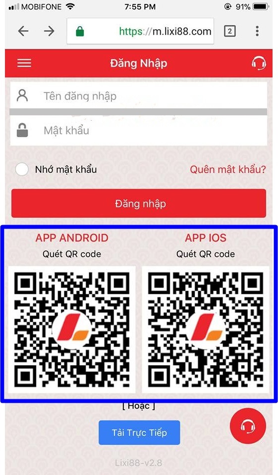 Trước tiên, bạn cần đăng nhập vào lixi88, hệ thống sẽ hiển thị với 2 mã Quét QR code cho APP ANDROID và APP IOS. Bạn hãy thao tác theo thứ tự như hình ảnh bên dưới: Chọn Tải trực tiếp sau đó hãy Click để tải về.
