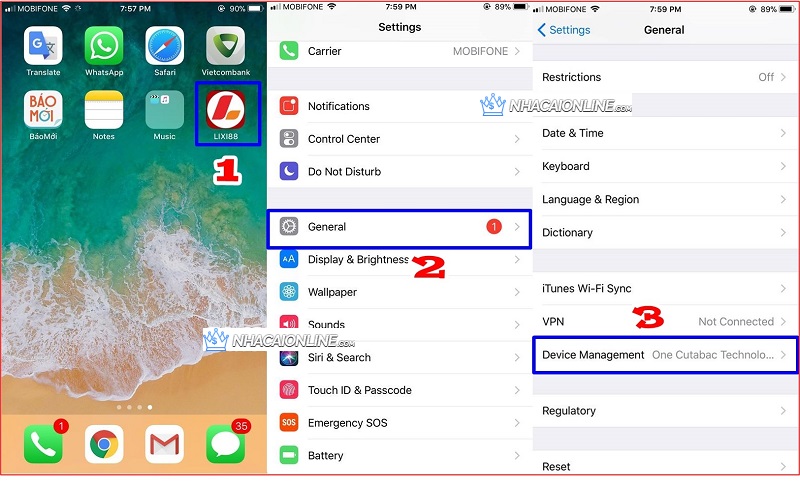 Để khắc phục được vấn đề, các bạn cần thực hiện thao tác như sau: Vào Setting (cài đặt), sau đó chọn General (cài đặt chung), tiếp tục chọn Device Manegement và chọn Tin cậy =>Trust.
