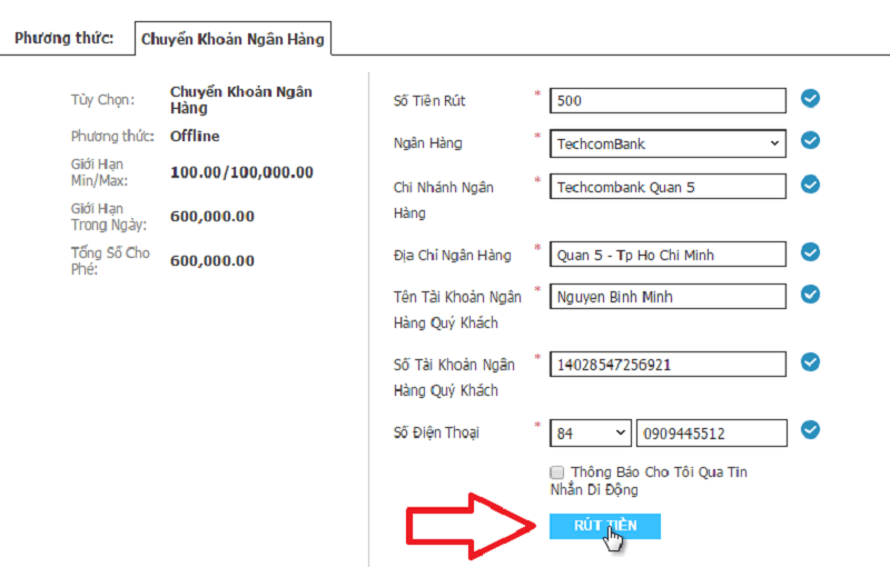 Sau khi bạn đã chuyển tiền về tài khoản chính, bạn hãy chọn mục Rút Tiền. Sẽ có được 1 bảng yêu cầu khách hà hàng nhập thông tin số tiền mà bạn muốn rút và thông tin tài khoản ngân hàng của khách hàng chơi để bộ phận thanh toán tại nhà cái W88 chuyển tiền thắng về cho bạn. Do đó, bạn cần phải nhập chính xác được tất cả thông tin trên.
