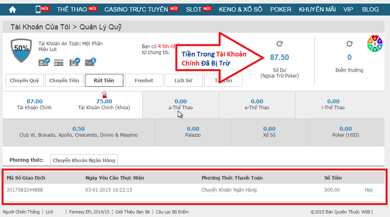 Sau khi điền đầy đủ tất cả các thông tin thì các bạn hãy nhấp chuột cọn mục rút tiền để có thể hoàn tất được lệnh rút tiền W88. Lúc này ở trong mục Quản lý quỹ, khách hàng chơi sẽ thấy số tiền đã bị trừ trong tài khoản chính và sẽ có được 1 dòng thông báo lệnh rút tiền của người chơi sẽ đang được xử lý.