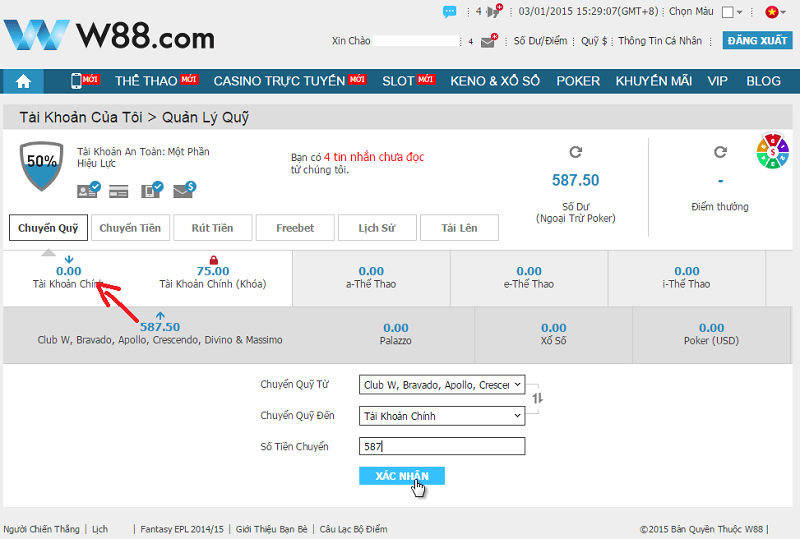 Khi người chơi nộp tiên vào tài khoản W88 thì số tiền sẽ được cập nhật vào tài khoản Chính của người chơi đó. Nếu muốn chơi Casino, Thể Thao, Poker, Keno, Xổ Số,… thì bạn phải chuyển tiền từ tài khoản chính về những tài khoản phụ đó.
